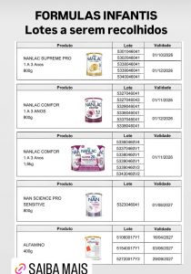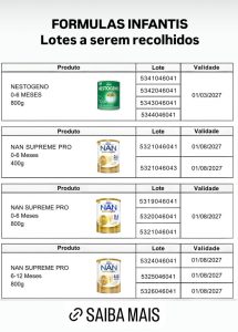 A Agência Nacional de Vigilância Sanitária (Anvisa) determinou a suspensão da venda de lotes específicos de fórmulas infantis da Nestlé, das marcas Nestogeno, Nan Supreme Pro, Nanlac Supreme Pro, Nanlac Comfor, Nan Sensitive e Alfamino, após a identificação de risco potencial de contaminação pela toxina cereulide, produzida pela bactéria Bacillus cereus.