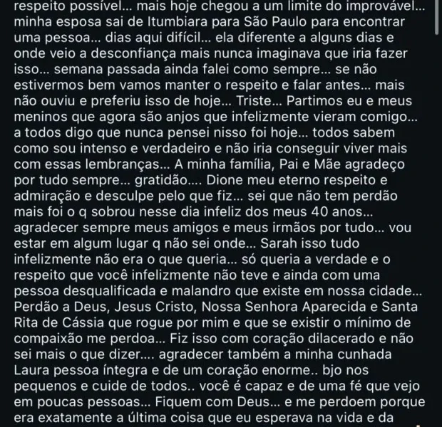 Em uma publicação que circulou nas redes sociais, o secretário de Governo de Itumbiara, Thales Machado, que matou os dois filhos e, em seguida, tirou a própria vida na quinta-feira (12), deixou uma mensagem interpretada como despedida, na qual relatava viver um momento de crise pessoal. No texto, ele mencionou dificuldades no relacionamento conjugal e citou uma viagem da esposa para São Paulo, descrevendo a situação sob sua própria perspectiva, sem apresentação de detalhes adicionais ou confirmações. A postagem foi feita no dia em que Thales completava 40 anos. Em um dos trechos, ele se referiu aos filhos como “anjos” e utilizou expressões consideradas sensíveis, o que conferiu ao conteúdo um tom de preocupação. Posteriormente, a publicação passou por alterações. O conteúdo original deixou de estar integralmente disponível na rede social, e não há informações oficiais sobre os motivos das mudanças nem sobre quem teria realizado as edições. Ao final da mensagem, Thales pediu perdão a familiares, amigos e a Deus. Paraíba Debate